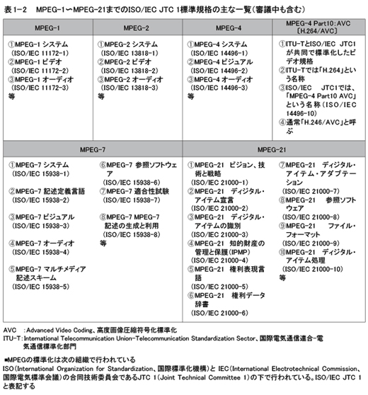 なお、『デジタル放送教科書』では上巻、下巻にわたってMPEG-1、MPEG-2、MPEG-4、H.264/AVC、MPEG-7、MPEG-21など、H.264/AVCも含めてMPEG全般にわたって解説していますので、それぞれの標準の一覧を表1-2に示しておきます(審議中も含む)。各MPEG標準(注.「H.264/AVC」はビデオ圧縮のみの標準)は、例えばMPEG-1は「MPEG-1システム、MPEG-1ビデオ、MPEG-オーディオ」などというように、複数の標準で構成されていることに注意してください。