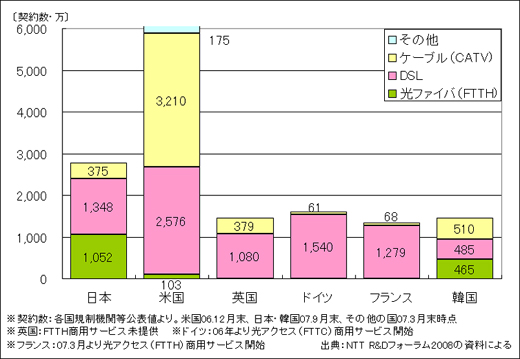 図3に示すように、日本の光ファイバ・アクセス網(FTTH)は、世界で最も普及(1000万契約を突破、2007年9月末現在)し、安い料金で提供されていることもあり、日本は世界のブロードバンド先進国となっています。