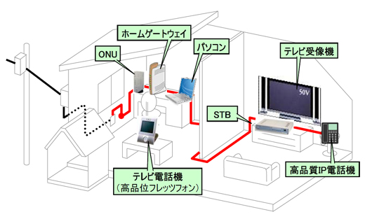 このような状況を背景に、2006年12月から2007年12月の1年間、NTTはNGNフィールドトライアル(実証実験)を実施し、東京と大阪の2カ所にショールーム「NOTE」を開設し展示してきました。図4に、NGNフィールドトライアルで行われた、一般のモニター宅における端末機器の設置イメージを示します。