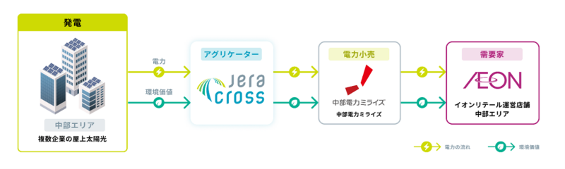 今回の取り組みでは、JERAのグループ会社である株式会社JERA Crossがアグリゲーター注1として、複数の屋根設置型太陽光発電が生み出す余剰電力を束ね、中部電力ミライズ株式会社を通じてイオンリテールの店舗や事務所へと供給する。