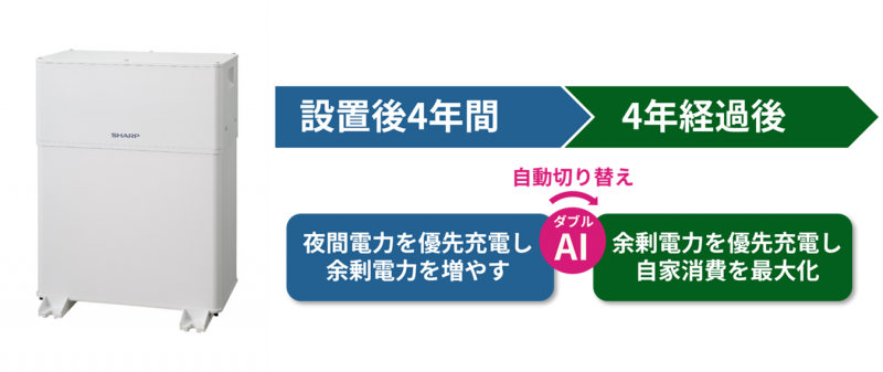 新FIT制度では、設置後4年間は、夜間の電気料金単価が買取単価よりも安価になる電力プランがある。新サービスでは、AI技術が各家庭の生活パターンを学習して日中の電力消費量を予測し、日中に必要なる分を夜間に充電する。これにより、日中の太陽光発電による余剰電力量を最大化するという。