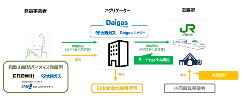 JR東日本によるバーチャルPPAのスキームでは、JR東日本は、株式会社エネウィルと大阪ガス株式会社、SMFLみらいパートナーズ株式会社が出資する和歌山御坊バイオマス発電所(和歌山県御坊市)の発電量に応じた環境価値を、大阪ガスが非FIT非化石証書注1としてJR東日本に提供する
